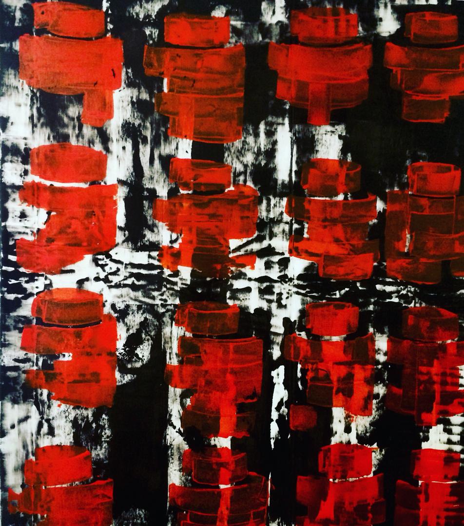 Cependant, tous ces thèmes, bien qu’ils soient inspirés de la vie très profonde du peuple, Sterlin spatialement leur enlève tout contexte et les entasse même pour leur donner une allure abstraite où les éléments se trouvent hors temps et hors lieu. Cette mise en page renforce le côté tragique de la réalité. En décontextualisant les choses, Sterlin les intègre dans une situation qui dépasse l’individu, mais qu’il subit. L’œuvre de Phaidra Sterlin, en ce sens est éminemment sociale. Il en est de même pour les tableaux où les personnages sont insérés dans des réseaux lignes et de couleurs, ils y sont visibles à travers un élément qui est le plus souvent la tête ou un œil. Ils y sont dans cette condition incapable d’affirmer leur personnalité.  D’autres œuvres nous plongent dans l’abstraction totale, mais toujours avec une palette très réduite de deux à trois couleurs.  C’est là un langage simple pour exprimer un fait complexe. La vision artistique de Sterlin contrairement à ce qu’on peut croire à première vue, est le fruit d’une vision méditative, murie des choses.