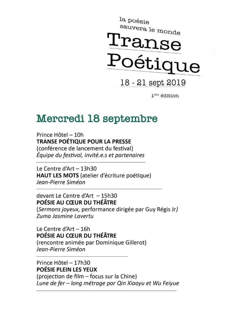 Quant au Festival Transe Poétique, organisé sur le thème « La poésie sauvera le monde », phrase controversée empruntée à Jean-Pierre Siméon, poète et invité d’honneur de cette première édition, initié par le poète et directeur artistique Jean D’Amérique. Celui-ci partage ces mots, sur le site de Loque Urbaine – l’institution qui porte le festival – pour conceptualiser un peu le thème :